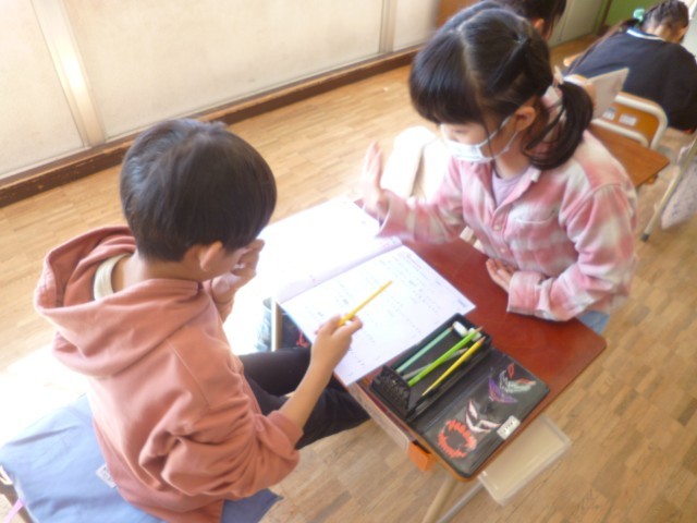 1年生算数の授業の様子です。算数ドリルのまとめをやりました。これまで1年間学習してきたことの総まとめです。1つ1つの問題を確認しながら解いていました。分からないときは、友達同士で、教え合うこともしていて、とても成長を感じます。