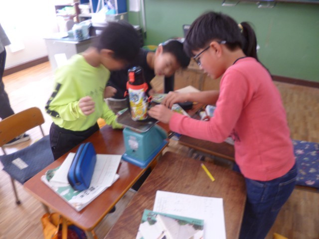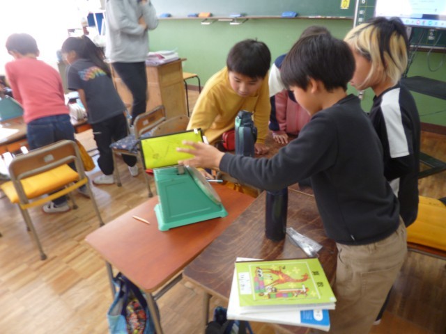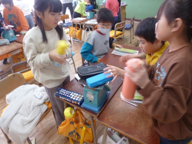 3年生算数「おもさ」の授業の様子です。はかりの目盛りを読むのが、なかなか難しいので、実際のはかりを使って、目盛りを読む復習をしました。はかりの大きさによって、測ることができる重さや1目盛りの大きさが違うことを確かめました。教室内にあるいろいろな物の重さをはかっていました。