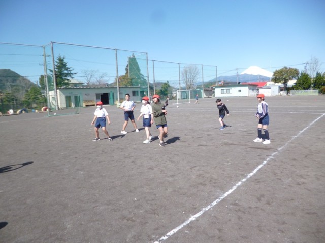 5年生体育の授業の様子です。運動場にコートを2面作って、試合を行いました。Aコートは、5人対5人で、試合を行いました。Bコートでは、3人対3人で、2分くらいしたら交代をして試合を続けていく形式でした。Bコートは、3人対3人なので、コートの中をみんなが動かないと点が入ってしまいます。3人の運動量が多く、いいシュートを打つ場面もたくさん見られました。