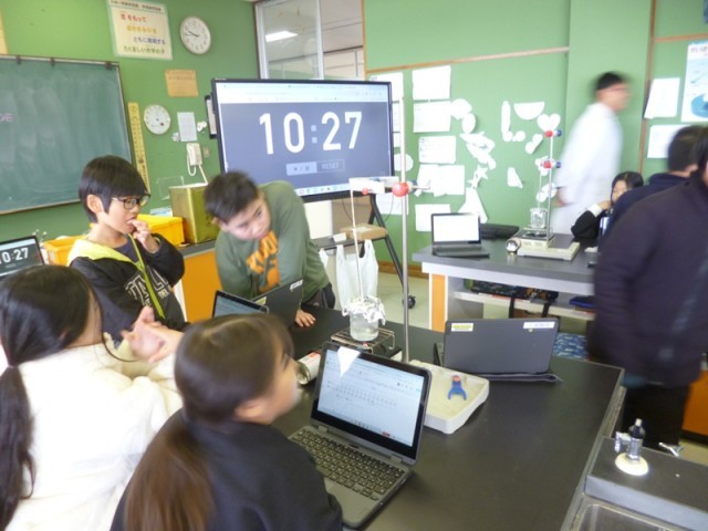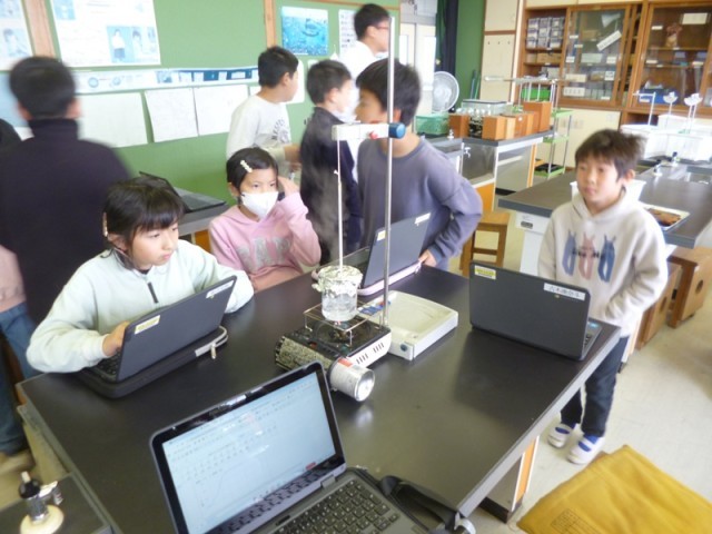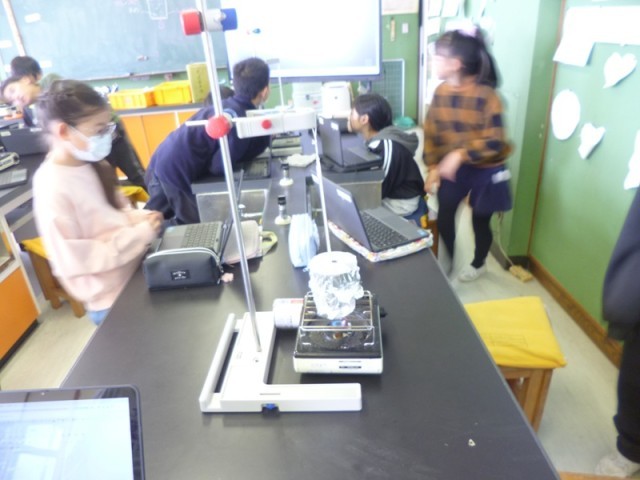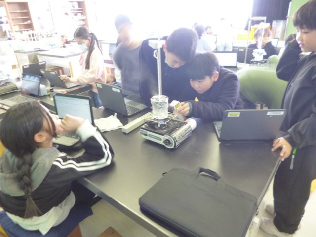 4年生理科の授業の様子です。水の温度がどこまで上がっていくのかを調べる実験をしました。いつものように、まずは予想をしました。それから実験です。水を温めて、だんだんと沸騰していきました。15分間調べていきます。1分ごと温度が何度になっているか表に書き入れていきました。最初は、すごく温度が上がったけれど、最後はいくら熱しても100度から温度が上がっていかないことに、びっくりしました。