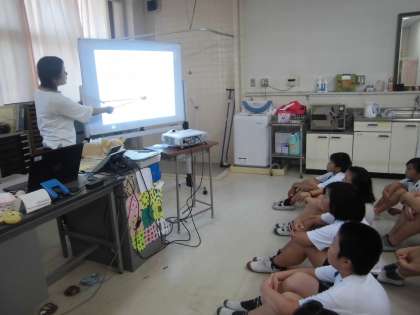 今日は保健室で坪内先生による歯みがきについての指導と,身体測定がありました。