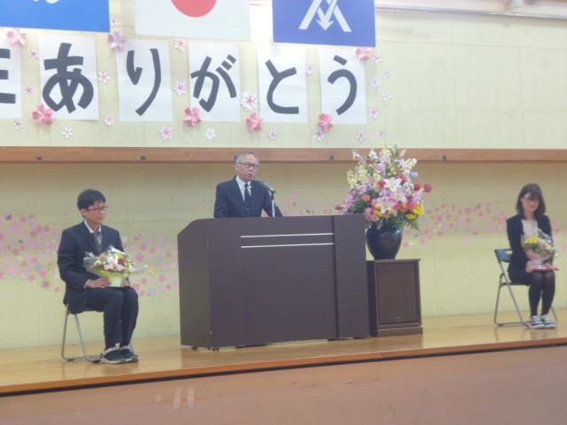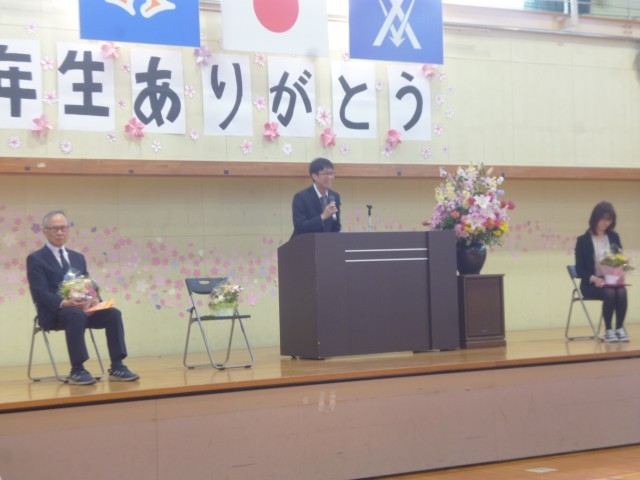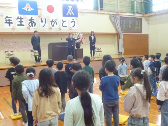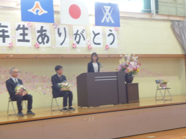 続いて、離任する先生方からのあいさつがありました。大平小学校の子どもたちに、温かいメッセージをたくさんいただきました。最後、全員で大平小学校の校歌を歌い、離任する先生方を見送りました。先生方が大平小学校から他校に行ってしまうのは、さみしいですが、とても心が温まる離任式でした。