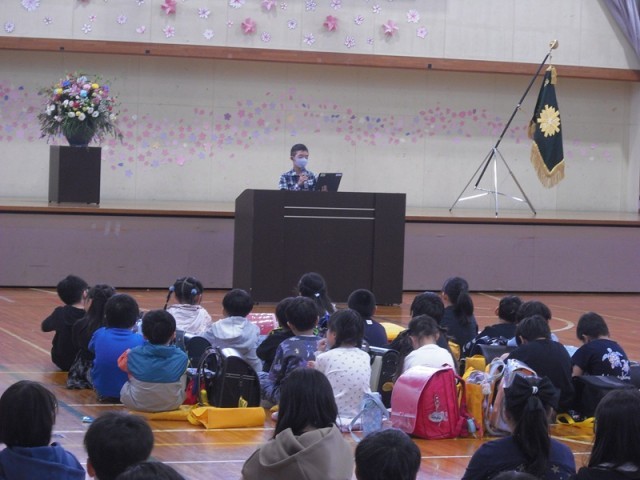 始業式では、最初に6年生の代表児童が、今年頑張りたいことを発表してくれました。「下級生に優しくして学校のことについていろいろと教えていきたい」「たてわり活動を頑張って、みんなで仲よくなっていきたい」「勉強を頑張っていきたい」と3つの大きな目標について話をしてくれました。とても立派な発表でした。