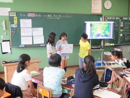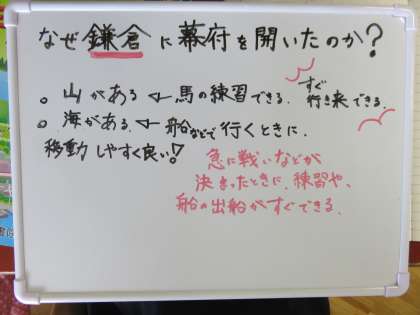 「源頼朝が、なぜ鎌倉に幕府を開いたのか」を考えました。山と海に囲まれている地形に着目し、守備がしやすい土地であることに気付きました。また、平清盛の戦術を参考にして考えるグループもあり、歴史学習につながりが感じられました。