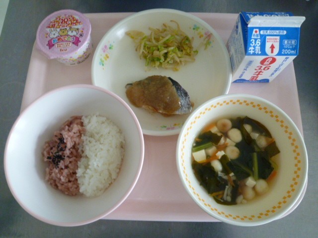 4月10日の給食は、一口赤飯、ご飯、牛乳、鰆のごま味噌だれ、おひたし、お祝いすまし汁、デザート(いちごゼリー)でした。