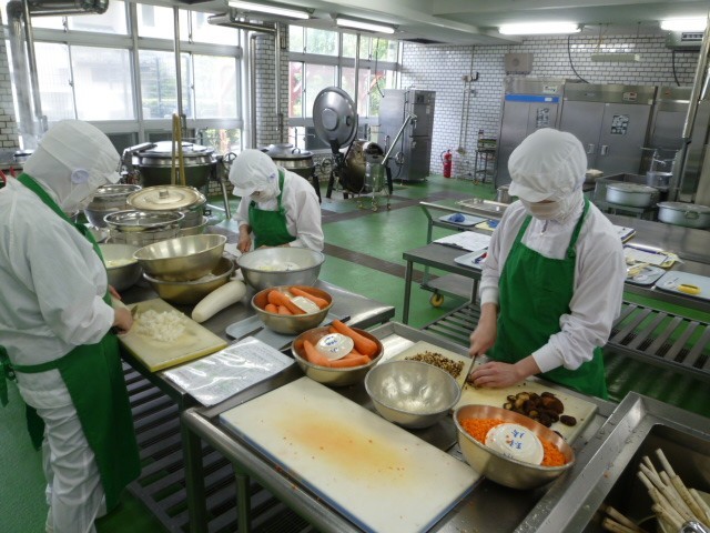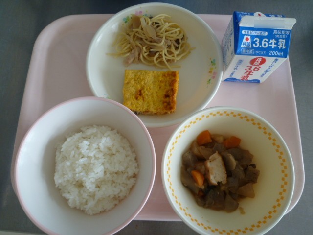 4月13日の給食は、ご飯、牛乳、五目玉子焼き、山菜ソテー、生揚げと野菜の旨煮でした。