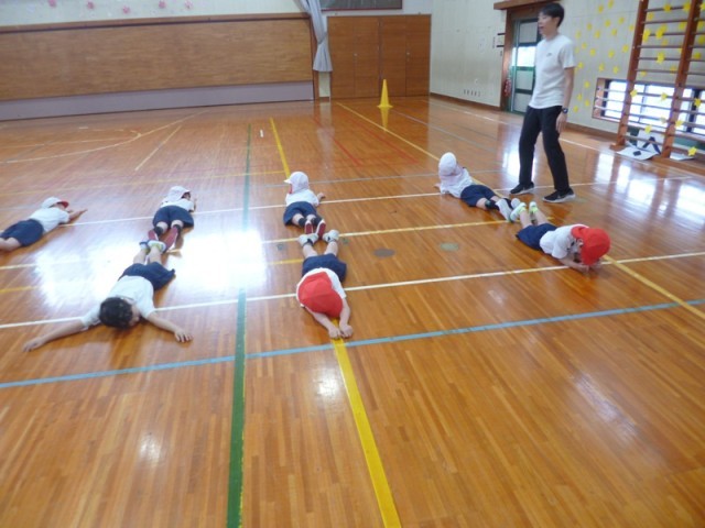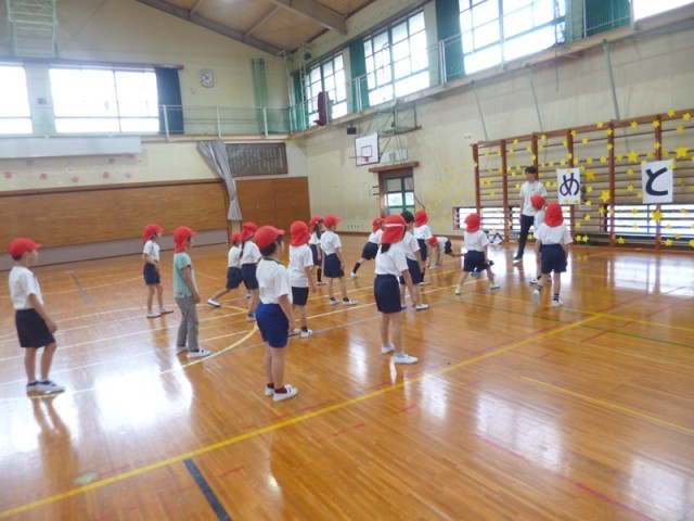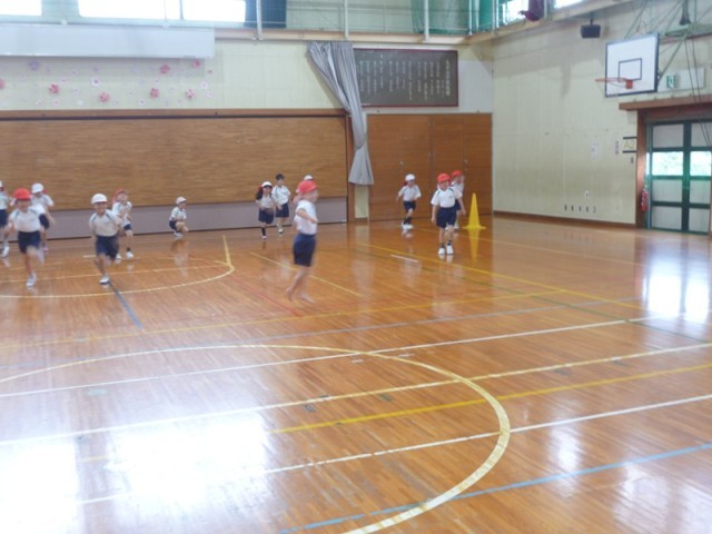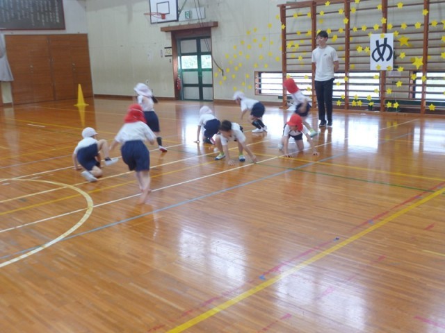2年生体育の授業の様子です。今年度初めての体育の授業です。まずは、みんなで準備体操をしっかりとしました。その後「ねこ」と「ねずみ」を行いました。2列に並んでねこチームとねずみチームに分かれました。先生が「ねこ」や「ねずみ」を言います。「ねこ」と言ったら、ねこが逃げます。反対に「ねずみ」と言ったら、ねずみが逃げます。先生の声をよく聞いて、一生懸命に取り組み、汗がたくさん出ていました。