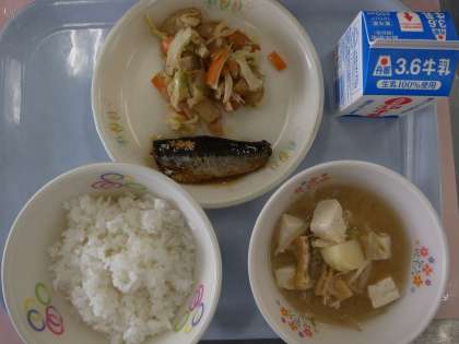 ごはん 牛乳 いわしの生姜煮 薩摩揚げと野菜の炒め物 もやしの味噌汁