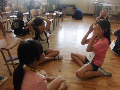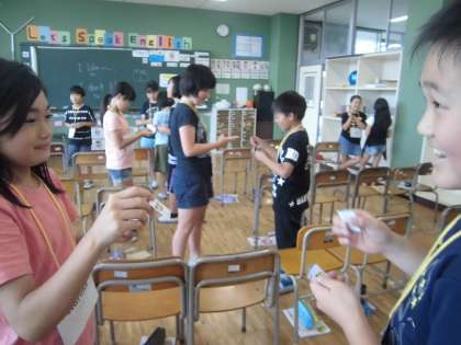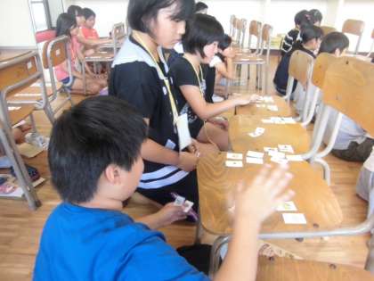 ALT・アーロン先生の発音を聞きながら繰り返し練習したり,覚えた表現を使ったコミュニケーションの練習をしました。