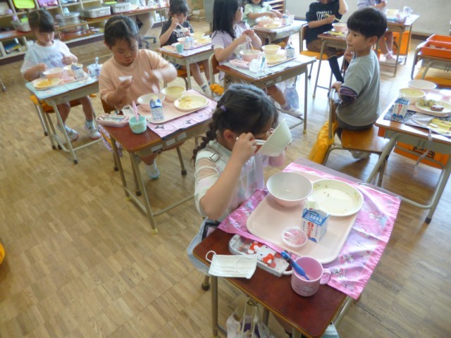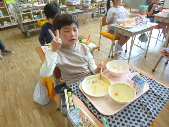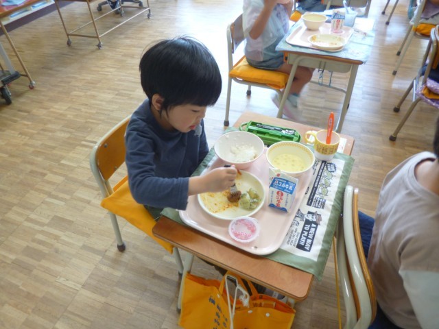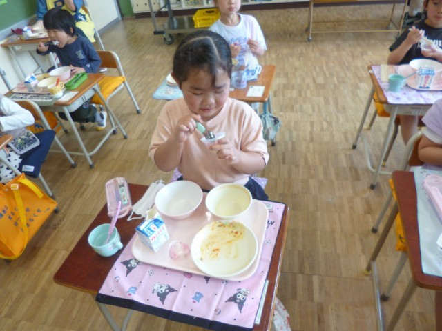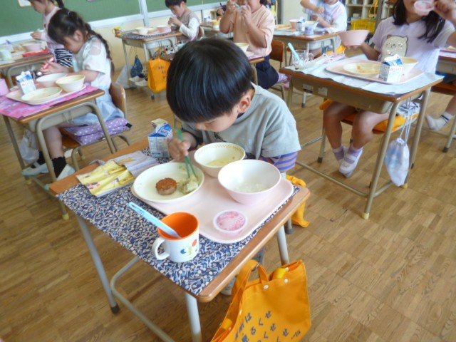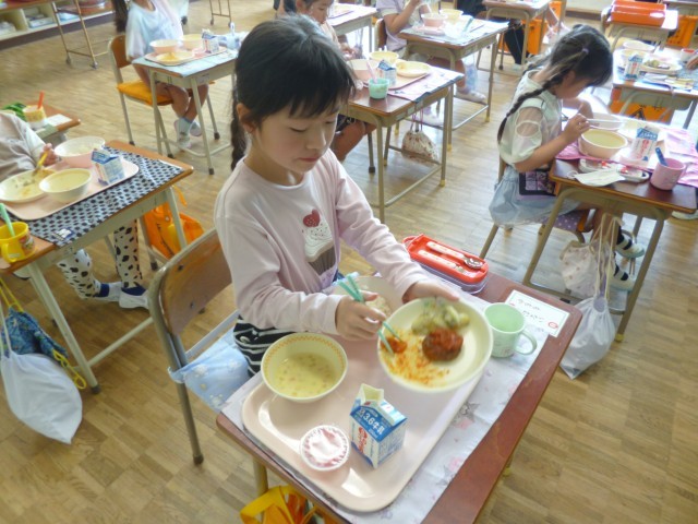 1年生、小学校生活初めての給食です。給食のついての約束を担任の先生や栄養士の先生と確認しました。4時間目が終わり、しっかりと手洗いをした後、給食当番の子は、給食着を着て、配膳をしました。初めてでしたが、とても上手にできました。食べ始めると「トマトハンバーグ、すごくおいしい」、「コーンチャウダーもおいしいよ」と、どの子も笑顔いっぱいでした。1年生には、入学のお祝いで特別に「さくらゼリー」もついていて喜んで食べていました。