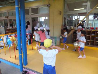 幼稚園の廊下では、造形遊びをしている子どもたちもいます。
