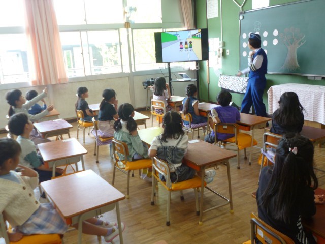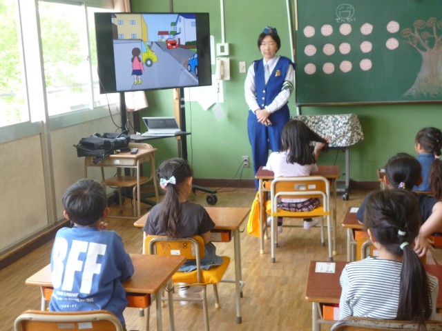 1年生が交通安全指導員から交通ルールとマナーについていろいろと教えていただきました。最初に、教室で歩道や路側帯を歩くときのルールや横断歩道を渡るときのルールなどについてのお話がありました。交通安全指導員さんの話をしっかりと聞くことができ、質問にもどんどんと答えることができました。