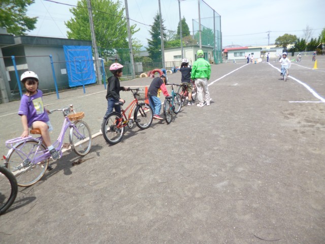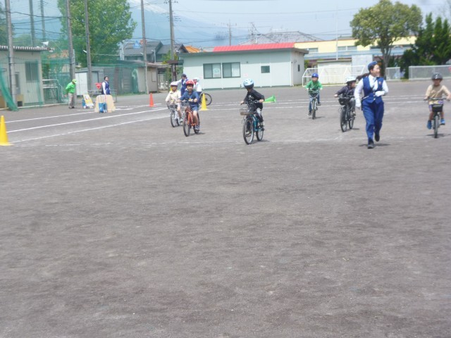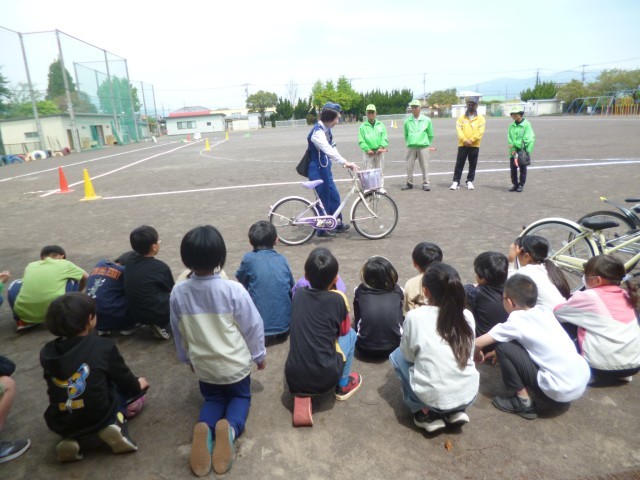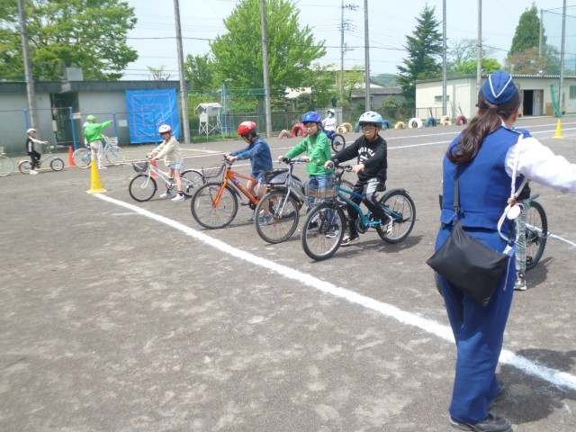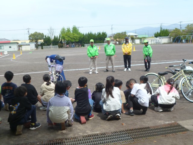 教室での講習会の後、運動場に出て、実際に自転車を使っての実技演習を行いました。最初に、交通安全指導員さんから自転車の乗るときの、自転車の点検の仕方やブレーキのかけ方を教えてもらいました。たくさんの約束がありましたが、4年生も指導員さんの話をしっかりと聴くことができました。実際に運動場で自転車に乗って運転をしてみました。運転やブレーキのかけ方も何度も繰り返し行い、しっかりと覚えることができました。4年生の皆さん、気をつけて自転車に乗ってくださいね。最後まで、手伝っていただいた大平地区安全協会の皆さん、大平駐在のおまわりさん、ありがとうございました。