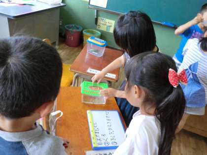 生活科の「いきものだいすき」で、子どもたちはいろいろな生き物を持ってきました。ホワイトボードに「1いきもののなまえ 2いろ 3そのほかのこと」を書いて、みんなの前に出て、自分が持ってきた生き物のことを紹介しました。