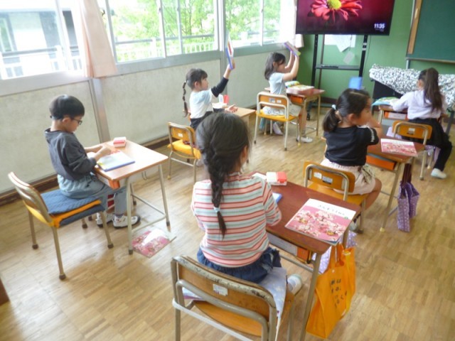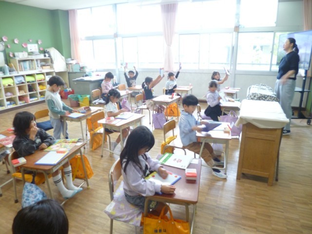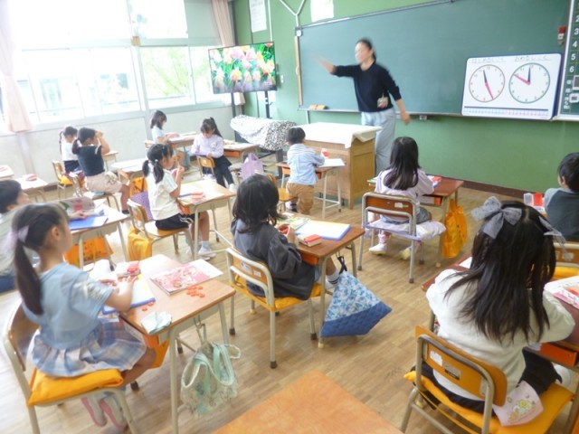 1年生算数の授業の様子です。1から10までの数について学習しました。算数ボックスのおはじきを活用しました。10までの数の問題を出して、どのように並べると数えやすいのかを考えながら、おはじきを並べていました。