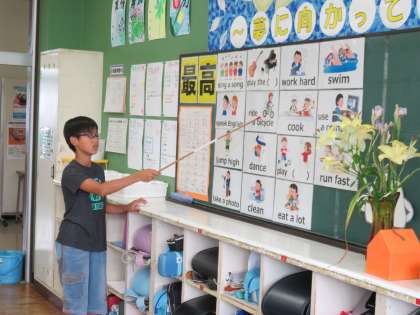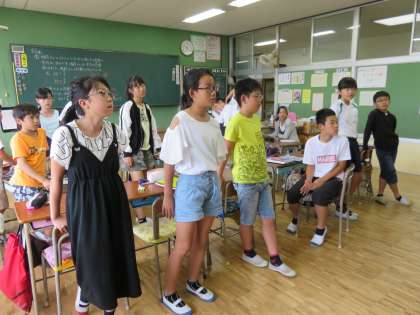 新しい表現が増えてきました。英語の授業以外でも、英語を話す機会を増やしていこうと思います。当番の子が指した言葉を、みんなでリピートしました。