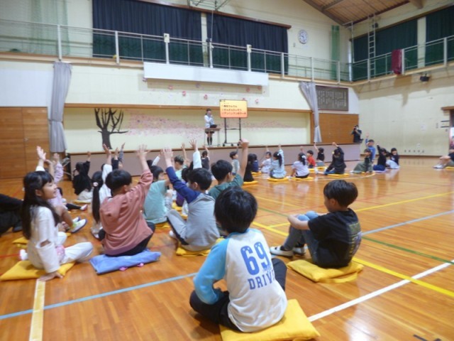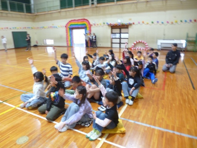 2つめの出し物は、イントロクイズです。曲のはじめを流して、曲名を当てます。クイズの解答は、3つから選ぶものでした。 曲が流れると、「知ってる」と多くの子どもたちが反応しました。曲は全部で7曲ありましたが、全問正解する子が多くいました。