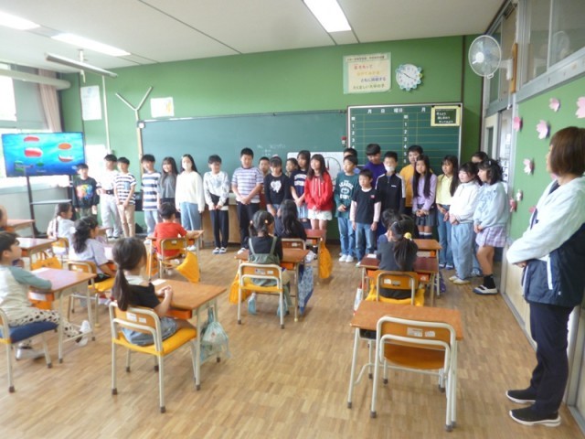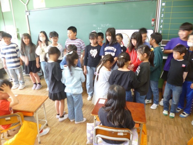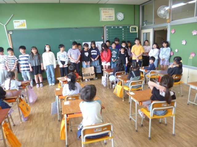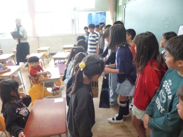 5年生が1年生の入学のお祝いのプレゼントを作ったのを1年生の教室に渡しに行きました。1年生が喜んでもらえるように1つ1つ丁寧にプレゼントを作りました。作ったのは、「紙コップけん玉とパックンチョ」です。休み時間に遊んでくれるのが楽しみです。