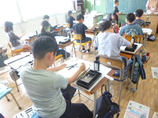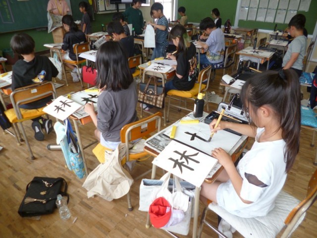 4年生書写の授業の様子です。今年度初めての毛筆の授業であったので、止め、はね、折れの練習を始めに行いました。3年生で習ったことの復習にもなりました。その後、「林」の文字の練習をしました。