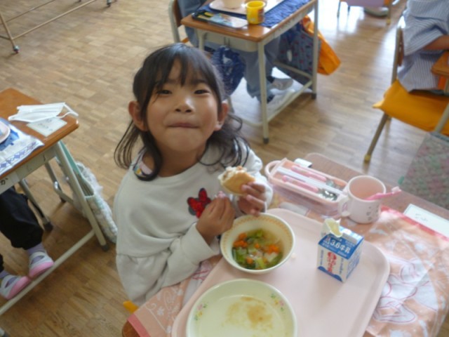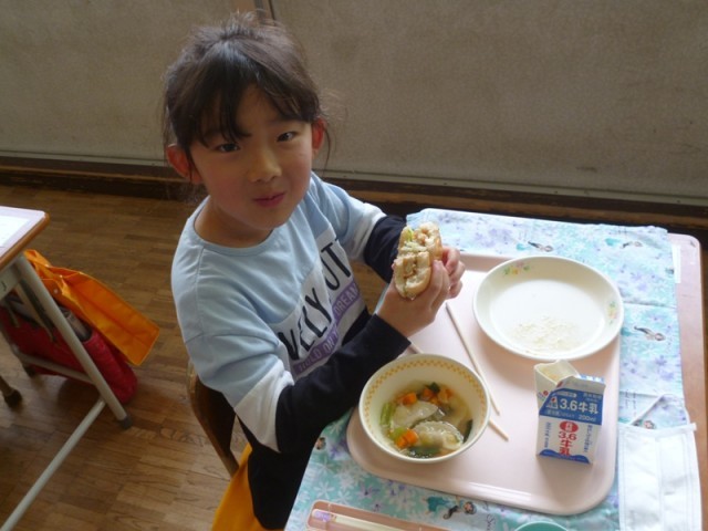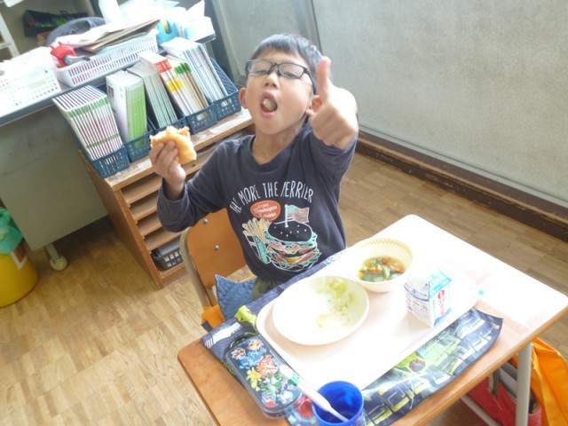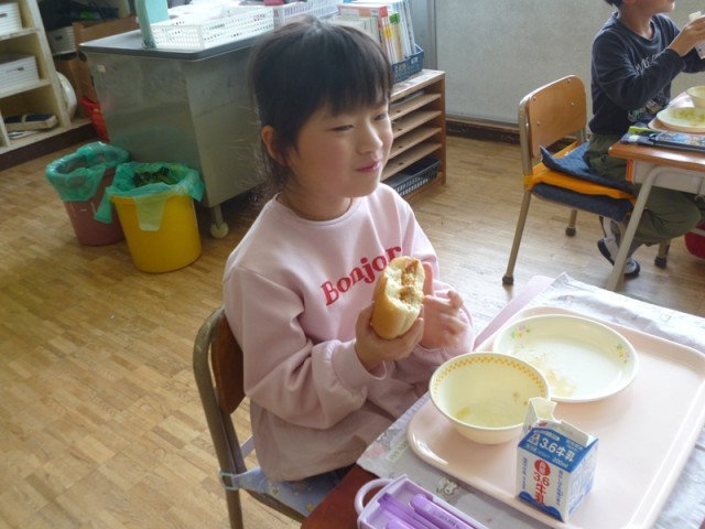 27日の給食は「丸型パン」に「和風メンチカツ」と「 ボイルドキャベツ」が出ました。パンの間にメンチカツとキャベツを挟んでハンバーガー風にして食べました。メンチカツの甘いソースとボイルドキャベツのバランスがとてもよく、大きく口を開けて、いい表情をして食べていました。
