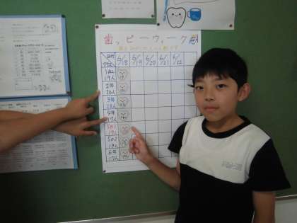 保健体育委員会が、みんなの歯みがきの様子をチェックし、みがいた人数を表にまとめていきます。