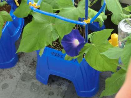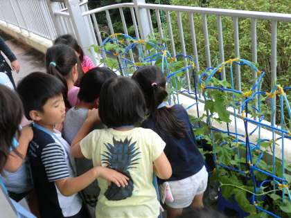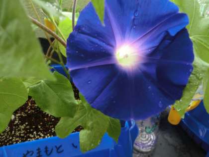 みんなが集まっているので、何かなと行ってみると、とってもきれいな青紫色の花が咲いていました。一つだけ咲いたあさがおの花を見て、他の子どもたちはとってもとってもうらやましそうです。