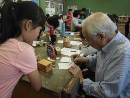事前に一人一人の「はんこにしたい文字」を篆刻の文字に変換してくださった用紙をもとに,はんこの文字をうつしていきました。