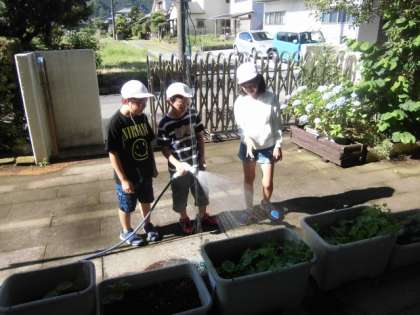 校長室南側のプランターに植えられたツルレイシに、水をやっています♫