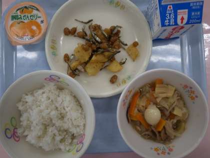 麦ご飯 牛乳 中華丼 大豆と小魚の揚げ煮 デザート(みかんゼリー)