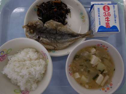 ごはん 牛乳 あじのひもの ひじきの炒め煮 じゃがいもの味噌汁