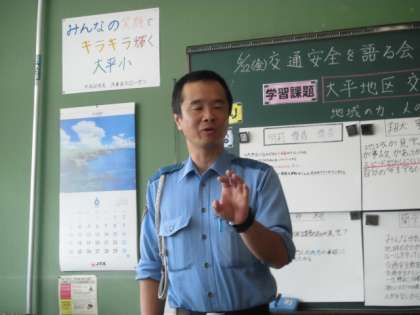 「全国では、交通事故で1日10人以上の方が亡くなっています。交通死亡事故0は、あたりまえではありません。6年生は、交通安全リーダーとして、下級生に寄り添い、手をつなぎ歩き、横断歩道を渡ってくれます。この気持ちや温かさで、下級生は、安心して、安全に、登下校できています。形やルールではありませんが、一番価値のある、力のあることです。ありがとうございます。小学校を卒業し、中学校、高校、大学、社会人…。大平地区を支える人として、この交通死亡事故0を続けていくように、つなげてください。」