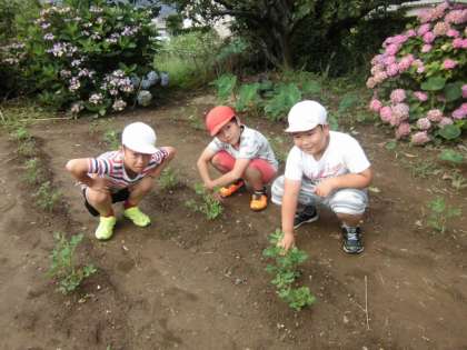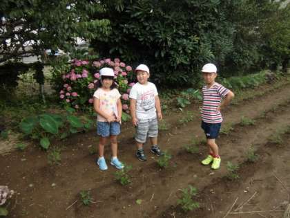 朝、地域の方が貸してくださっている畑に、3年生が水をやりにいきます。