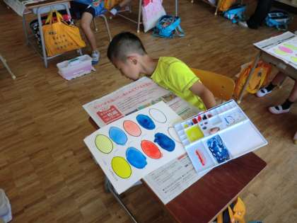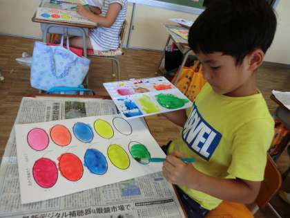 絵の具の色の濃い・薄いの学習をしました。合わせて、筆の使い方も勉強しました。「頭をいい子いい子ってしてもらうとき、髪の毛ぐちゃぐちゃにされるより、同じ方向になでなでされたいでしょう?」と聞くと、大きくうなずく子どもたち。丁寧にいろ塗りをしていました。
