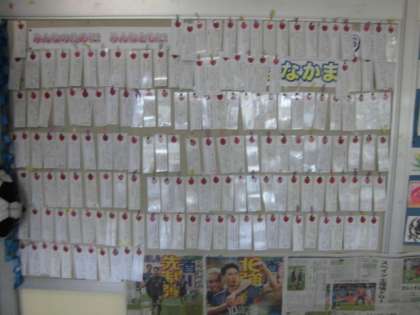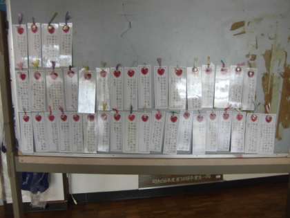 子どもたちが、「学校生活をもっとゆたかにするためのアンケート」に書いた、キラキラ輝く学校にしてくれている人のことが、本のしおりになって掲示されています。