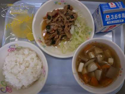 ごはん 牛乳 スタミナ焼き肉 ボイルドキャベツ けんちん汁 果物(パイン)