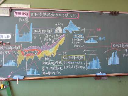 「日本地図を書いてみよう」ということから始めて、日本の気候の特色を調べました。気温と降水量のグラフを読み取りながら、6つの気候区分を学習しました。