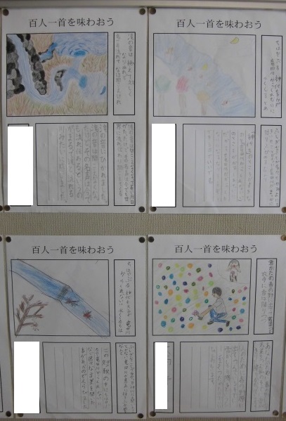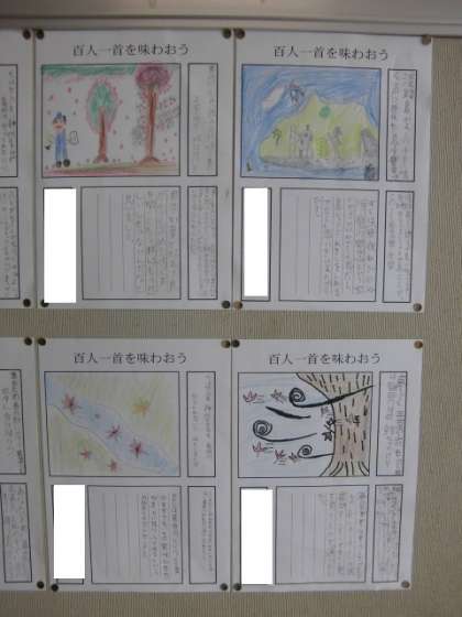 4年1組では、国語で取り組んだ百人一首の作品が廊下に掲示されています。