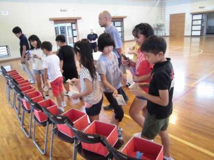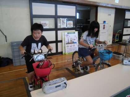 電球とラジカセを止めないように、停電しないように、ペダルをこぎます!
