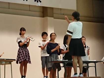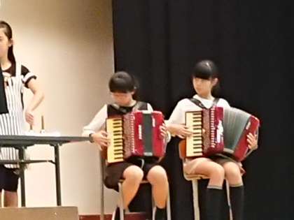 ハンドベル、鉄琴、アコーディオン、リコーダー、鍵盤ハーモニカの音色が、大平中学校の体育館に響きます♩