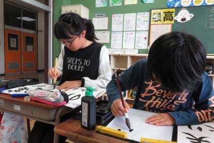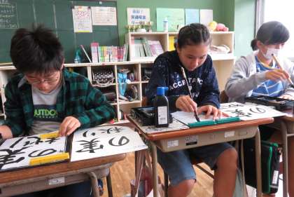 毛筆「実りの秋」の清書です。みんな、真剣に書いています。