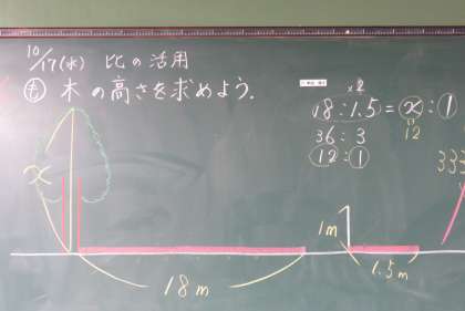 「比とその応用」の学習です。比を活用して、影の長さをもとに、いろいろな高さを調べました。