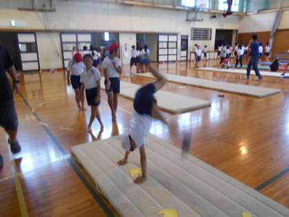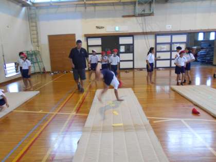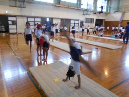今日の5時間目は、1・2組合同でマット運動に取り組みました。カエルの足打ちや川跳びなどの準備運動のあと、動画で動きを確かめました。手や足の位置を確かめて何回も練習を繰り返すうちに、こつをつかむことができてきました。