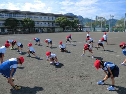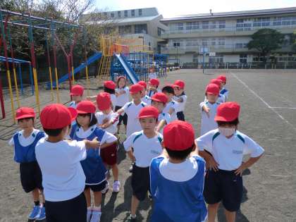 「整列します。前へならえ!」の、係の号令で、きれいに整列できるようになりました。学習も折り返し地点に来ていますが、体育の学習も、1年生がんばっています。