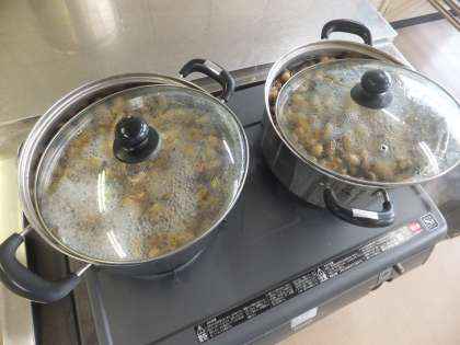 7人のお母さん方が、大平小の家庭科室に集まってくださり、落花生をゆでてくださいました。