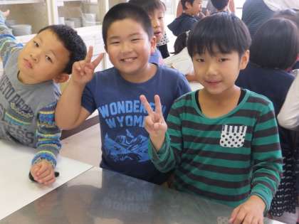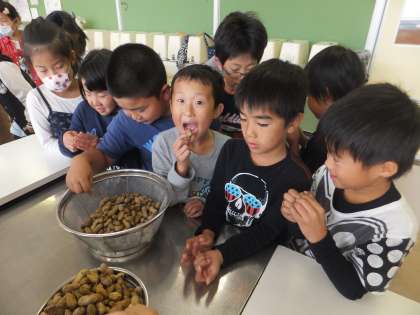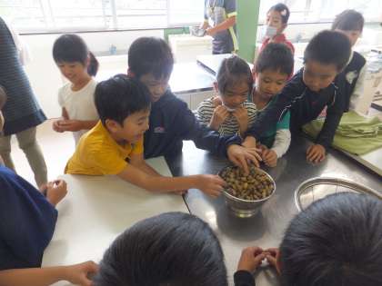 3年生の子どもたちが、家庭科室にやってきて、ゆで落花生をいよいよ試食です。