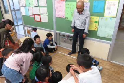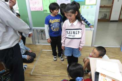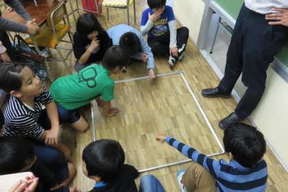 面積の学習をしていました。1平方mの大きさを体験して、何人入れる広さなのか試していました。