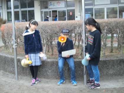 放送機器が故障で使用できないため、情報委員がハンドマイクを使い校外放送です!!