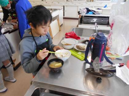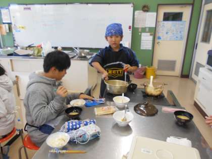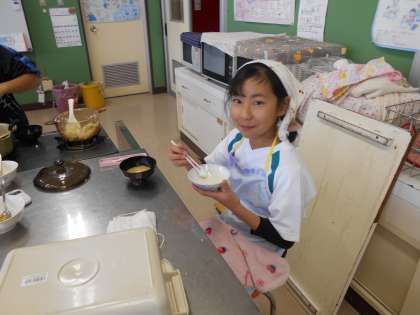 ふり返りでは、味噌汁は「だし、具材、味噌で味が決まることが分かりました。」「色や切り方が大切だと思いました。」「初めて作ったけど、おいしくできたからまたお家でも作ってみたいです。」と感想があり、実践意欲がわいてきたようでした。