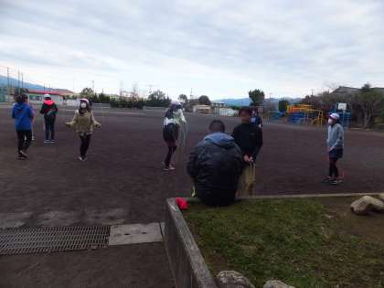 寒い朝ですが、子どもたちは、運動場で、なわとび運動に取り組んでいます。
