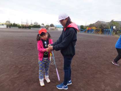 なわとび運動が初めての1年生には、6年生がやさしく教えてあげていました。
